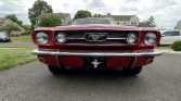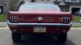 The car is said to have been refinished in red approximately 12 years ago. Features include chrome bumpers, Mustang 2+2 and 289 fender emblems, and dual exhaust outlets exiting through the rear valance. The seller added fog lights to the grille.