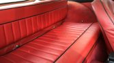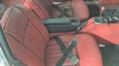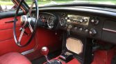 The interior features seats trimmed in red leather with black piping, and matching upholstery covers the door panels. MG-branded black mats cover the red carpets, and equipment includes wind-up windows, a heater, front and rear vent windows, and a Blaupunkt push-button radio paired with an under-dashboard speaker. Additions include lap belts, a center console with an armrest, and a wooden shift knob.