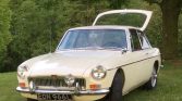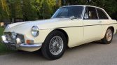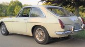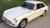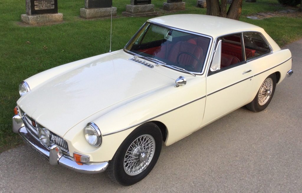 The seller states that corrosion on the rocker panels was repaired and the body was subsequently refinished in Old English White. Exterior details include chrome bumpers, a left-side fender-mounted mirror, MGB GT badging, and an aftermarket locking gas filler cap.