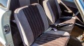 The cabin features front bucket seats and a rear bench upholstered in gray cloth with black inserts as well as matching door panels and gray carpets. Additional equipment includes a body-color dashboard, an aftermarket shifter, manual-crank windows, and square-weave floor mats.