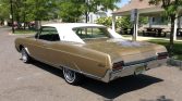The car has been refinished in gold with a white roof and is equipped with fender skirts, front and rear chrome bumpers, parking lamps, an angled horizontal bar grille, a powered driver-side mirror, and rectangular taillamps.