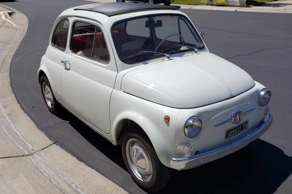 The 1967 Fiat 500F is powered by a 499L inline-twin paired with a four-speed manual gearbox, and refurbishment work is said to have included a repaint in white, an engine rebuild, and overhauls of the brakes and wiring. Features include red upholstery with white piping, a black cloth sunroof, polished hubcaps, and Italian license plates. Recent service reportedly includes replacing the battery.