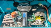 This 1967 Fiat 850 Spider is finished in blue over black vinyl and powered by an 843cc inline-four paired with a rebuilt four-speed manual transaxle. Additional equipment includes a black soft top, 13″ Cromodora wheels, and a Nardi steering wheel. Maintenance during current ownership includes rebuilds of the transaxle and front brake calipers as well as replacement of the clutch, shifter linkage, horns, choke cable, tie rods, and rear shocks.