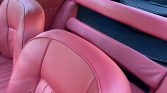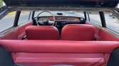 The cabin features front bucket seats and a rear bench that have been reupholstered in red leather with matching door panels and a contrasting black dashboard and carpeting. Equipment includes wood dash trim, a push-button AM/FM radio, a clock, and a glovebox. The floors are lined with rubber mats that were replaced in January 2017, and the crank for the left window was replaced in July 2020.