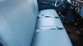 The cabin features steel surfaces painted in Light Blue along with a bench seat upholstered in blue vinyl with a matching dash pad, lap belts, and door panels. Equipment includes a rubber floor liner, chrome sill plates, a defroster and heater, two-speed wipers, and a push-button radio.