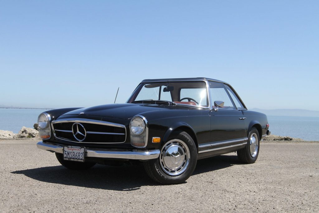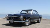 This 1968 Mercedes-Benz 280SL was purchased by the seller in 1974 and has reportedly remained in the San Francisco area since. It is finished in black over red leather and is powered by a 2.8-liter inline-six paired with a four-speed manual transmission. Equipment includes a black removable hardtop, a white soft top, 14″ steel wheels with chrome covers, an analog clock, a push-button radio, and air conditioning. Service since 2019 includes replacing the timing chain tensioner, water…