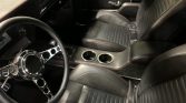 The interior features front and rear TMI seats clad in black upholstery with red stitching and microsuede bolster inserts, and matching treatments for the dashboard, center console, side panels, and trunk were also fitted. Replacement black carpeting is installed over an application of sound insulation, and additional features include a Lokar shifter, a three-spoke steering wheel, custom door and window hardware, and a climate control system sourced from Vintage Air.