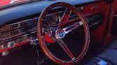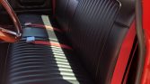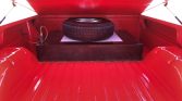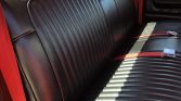 The cabin features a bench seat upholstered in black vinyl with matching door panel inserts and carpets as well as a dashboard painted to match the body. Additional appointments include an aftermarket wood-rimmed steering wheel, hand-crank windows with billet handles, red seat belts, air conditioning, shoulder belts for the driver and passenger, and an Audiovox cassette stereo.