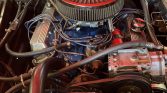 The replacement 428ci V8 was installed during prior ownership and features Cobra Jet cylinder heads, an open-element air cleaner, finned valve covers, a Holley carburetor, a Crane XR700 electronic ignition system, and tubular headers feeding a dual exhaust system. A 57-gallon auxiliary fuel tank has been mounted in the bed. Work since February 2021 is said to have included a recharge of the R134a air conditioning refrigerant and replacement of the engine mounts, valve cover gaskets, intake manifold gasket, belts, and spark plugs.