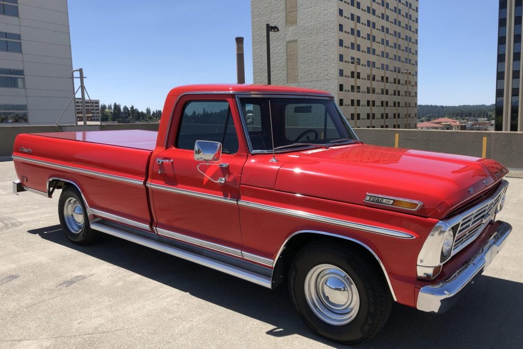 This 1969 Ford F-100 Ranger is a Styleside pickup that is finished in red over black vinyl and powered by a replacement 428ci V8 paired with a three-speed automatic transmission. Additional equipment includes a Dana 61 rear axle with Positraction, power steering, power front disc brakes, rear air helper springs, an auxiliary fuel tank, electronic ignition, air conditioning, tinted windows, and a dual exhaust system. The truck was delivered new to Damerow Ford in Beaverton, Oregon, and later spent time in Idaho, Arizona, Montana, and Alaska before being acquired by the seller in February 2021. Subsequent maintenance has reportedly included a recharge of the air conditioning refrigerant and replacement of the tires, rear pinion seal, powertrain mounts, universal joints, valve cover gaskets, intake manifold gasket, and spark plugs.