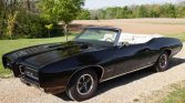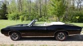 This 1969 Pontiac GTO convertible was delivered new to Star Pontiac of Washington, D.C. and is said to have undergone a refurbishment some time during previous ownership. It was acquired by the current owner approximately two years ago and is finished in Starlight Black with a power-operated Ivory soft top over Parchment vinyl. Power is provided by a numbers-matching 400ci V8 paired with a four-speed manual transmission. Additional features include a push-button AM/FM radio with an eight-track player, a hood-mounted tachometer, Hide-Away headlights, power-assisted steering and front disc brakes, and electric windows.