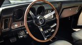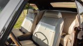 The cabin features bucket seats trimmed in Parchment vinyl along with matching door panels and a black dashboard and carpets. Amenities include a center console, a push-button AM/FM stereo with an eight-track player, electric windows, and power-assisted steering.