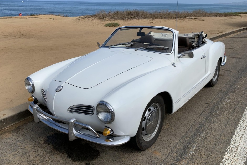 This 1969 Volkswagen Karmann Ghia convertible is finished in white over brown vinyl and powered by a replacement 1.6-liter flat-four paired with a four-speed manual transaxle. Features include a white convertible top, chrome bumpers and trim, 15″ steel wheels with chrome hubcaps, and a push-button AM/FM radio. The car was acquired by the seller and her husband out of Arizona in 2019, and subsequent work has reportedly included a valve adjustment, installation of PerTronix ignition, servicing of the brakes…