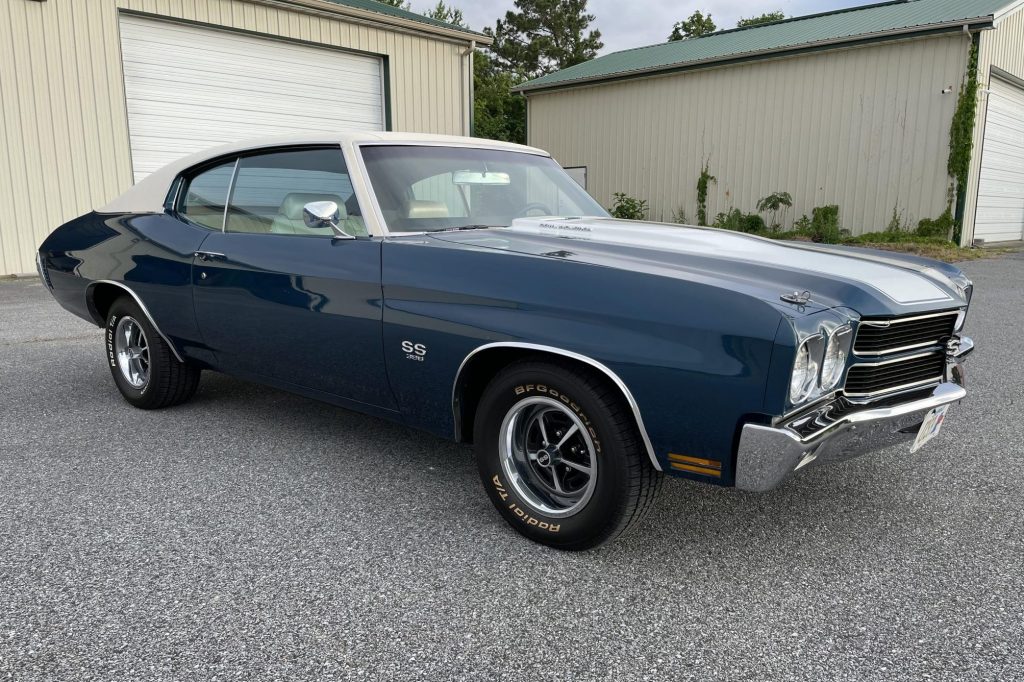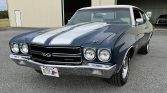 This 1970 Chevrolet Chevelle SS 396 was delivered new to Hullett Chevrolet in Waskom, Texas, and was acquired by the seller from a family member in 2014. The car is finished in blue over Ivory vinyl and is powered by a 402ci V8 paired with a three-speed automatic transmission. Features include an Ivory vinyl roof, white racing stripes, a performance suspension, front disc brakes, SS-style wheels, air conditioning, and a Kenwood CD stereo. The seller reports that…