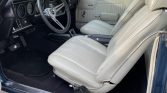 The interior features Strato Bucket seats, a rear bench, and door panels upholstered in Ivory vinyl (791) along with a black dashboard and carpets. Equipment includes air conditioning, front seat belts with shoulder harnesses, rear lap belts, a center console, an AM radio and 8-track player, a glove box-mounted Kenwood CD player, and a trunk-mounted Alpine amplifier.