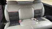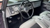 The cabin features power-adjustable front bucket seats and a rear bench that have been reportedly sourced from a 1998 Suburban and reupholstered in gray leather with black and red fabric inserts. Additional features include a black suede headliner and door panels, power windows, and a push-button AM radio.
