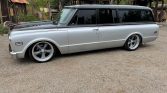 This 1970 Chevrolet Suburban is a three-door example that was refurbished and modified some time prior to its recent acquisition by the current owner. Finished in metallic silver with a black upper section and red pinstripe over a gray and black interior, the truck is powered by a 468ci V8 paired with a Turbo-Hydramatic three-speed automatic transmission. Additional features include air ride suspension, a push-button AM radio, power-adjustable seats, electric windows, staggered-width 20” American Racing wheels, and a hidden rear receiver hitch.
