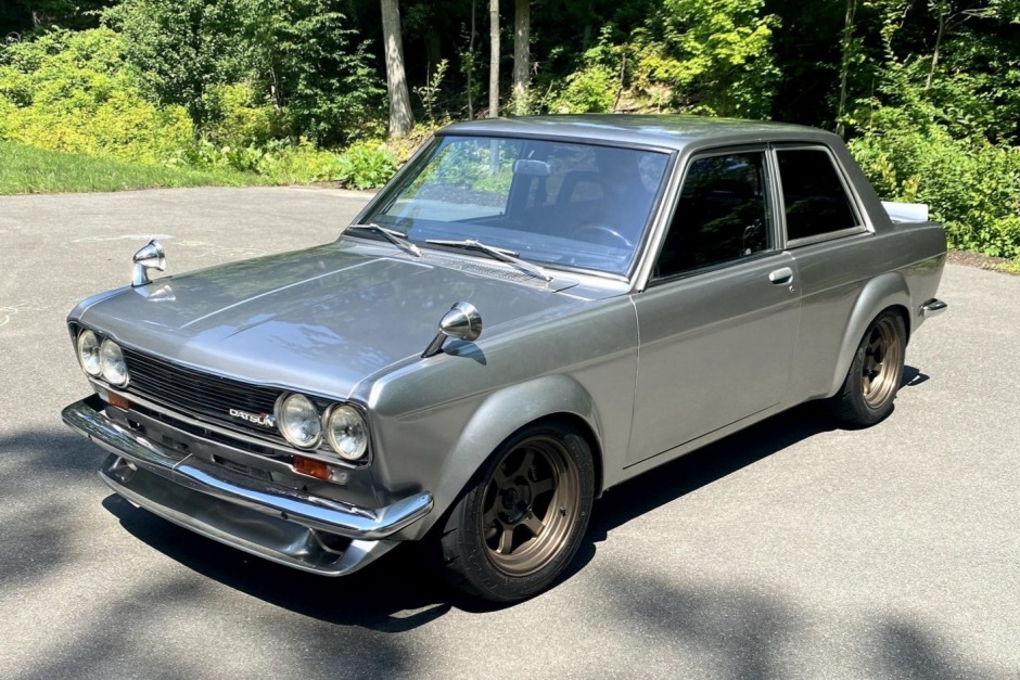 This 1970 Datsun 510 was acquired in 2018 by the seller and has since been modified with a 2.0-liter SR20DET fitted with a Garrett turbocharger, a CX Racing intercooler, and HKS camshafts. Power is sent to the rear wheels through a five-speed manual transmission with a Nismo twin-disc clutch and a limited-slip differential, and additional modifications include a repaint in Titanium Metallic and matching fender flares, along with 15″ Volk Racing wheels, Wilwood disc brakes, Techno Toy Tuning coilovers, Hyperco springs, Speedhut instrumentation, Recaro seats, and a Retrosound Bluetooth stereo.