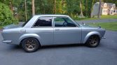 This 1970 Datsun 510 was acquired in 2018 by the seller and has since been modified with a 2.0-liter SR20DET fitted with a Garrett turbocharger, a CX Racing intercooler, and HKS camshafts. Power is sent to the rear wheels through a five-speed manual transmission with a Nismo twin-disc clutch and a limited-slip differential, and additional modifications include a repaint in Titanium Metallic and matching fender flares, along with 15″ Volk Racing wheels, Wilwood disc brakes, Techno Toy…