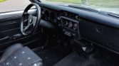 Recaro front bucket seats are upholstered in black with metal ventilation grommets and mesh headrest inserts. A custom SSS-style dashboard and replacement interior panels have been installed, along with a Retrosound Bluetooth stereo and a fire extinguisher. The seller states that the HVAC ducts have been replaced and the heater core has been rebuilt.