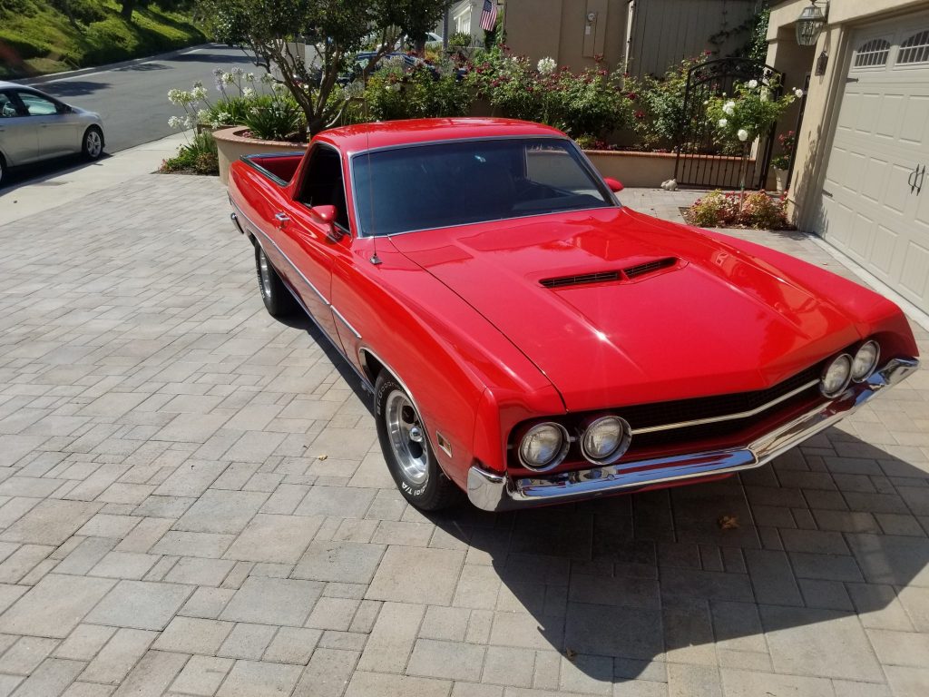 This 1970 Ford Ranchero was acquired by the seller in 1989 and subsequently refurbished. The truck is finished in red over black vinyl and is powered by a 351ci V8 paired with a three-speed automatic transmission. Features include 14″ mag-style wheels, front disc brakes, Gabriel rear shocks, a 9″ rear end, power steering, tubular headers, and a modern air-conditioning compressor. The seller states that recent service includes changing the fluids and replacing the oil pan, transmission pan, driveshaft, and differential pinion seal.