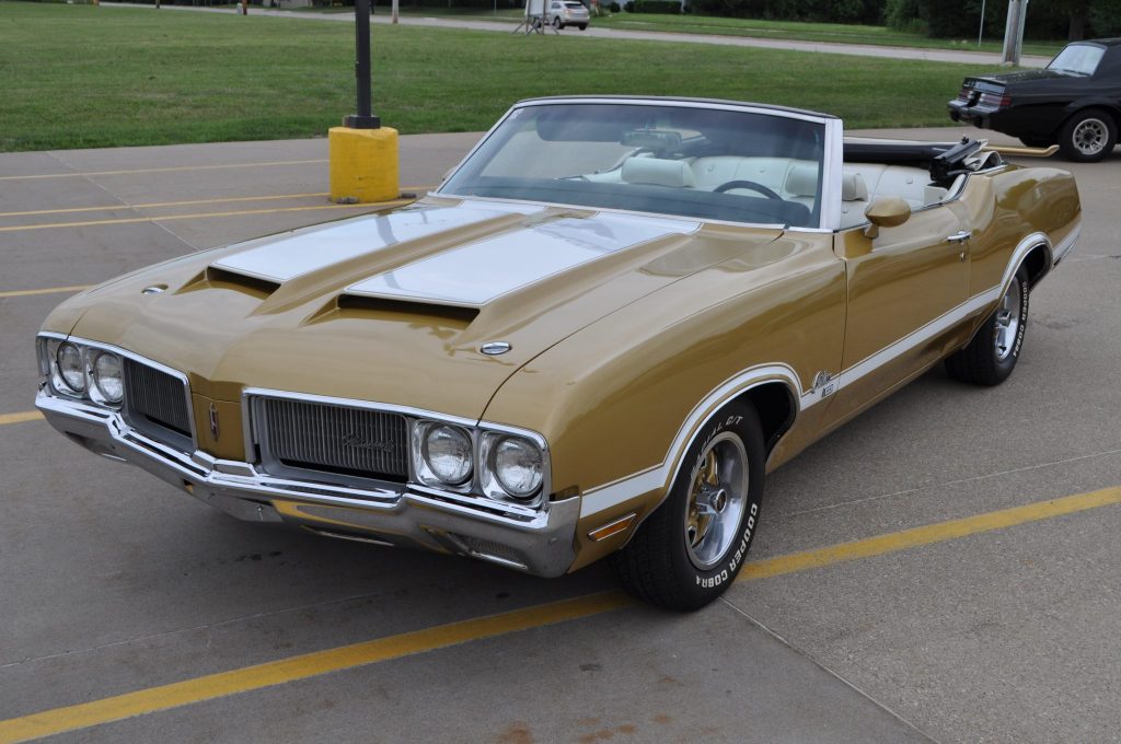 This 1970 Oldsmobile Cutlass Supreme convertible is finished in gold over white vinyl and is powered by a 455ci V8 paired with a three-speed automatic transmission. Equipment includes dual hood scoops, power brakes, power steering, a white soft top, a rear spoiler, and air conditioning. The seller acquired the car in 2021, and service in preparation for the sale is said to have included replacing the power steering pump, convertible top motor, transmission pan gasket, transmission governor, trunk lock, convertible top switch, and battery.
