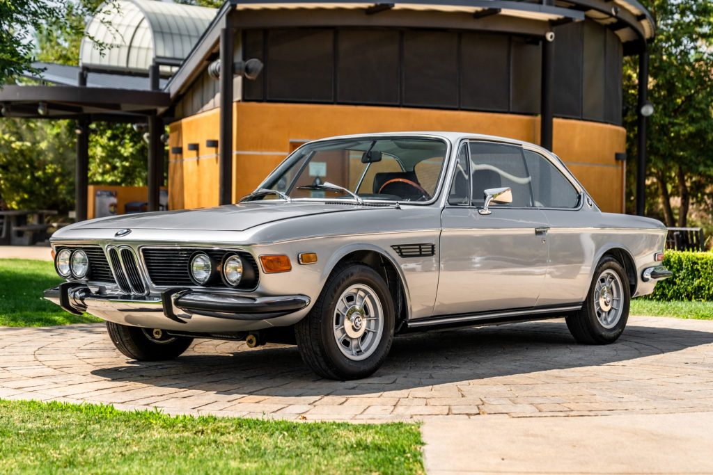 This 1971 BMW 2800CS was acquired by the current owner in 2019 as a project and was subsequently refurbished by Classic Rides Factory of Calimesa, California. The car is finished in silver over black leather upholstery, and power comes from a 2.8-liter inline-six paired with a five-speed manual transmission. Features include dual Weber DEGV carburetors, power-assisted front disc brakes, air conditioning, power windows, and a retro-style stereo. The transmission was installed and a tune-up was performed by La Jolla Independent in California in January 2021.