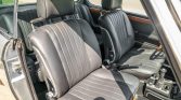 The cabin features bucket seats and headrests that were reupholstered in black leather during the refurbishment. A perforated white headliner was fitted, the woodgrain trim on the dash and doors is said to have been refinished, and a new turn signal stalk with windshield wiper switch was installed. Additional features include black carpets, power windows, and a retro-style stereo. The air conditioning system was serviced with a new compressor and converted to R134a.