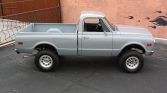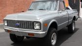 This 1971 Chevrolet K10 is a short-bed 4×4 pickup has been refinished in silver over two-tone black and gray leather, and power is supplied by a replacement 350ci V8 paired with a three-speed automatic transmission and a dual-range transfer case. Other modifications include 17″ KMC wheels with all-terrain tires, a 4″ suspension lift, front disc brakes, power steering, Holley fuel injection, a Vintage Air HVAC system, and a Kenwood stereo with Bluetooth connectivity.
