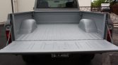Originally finished in white, the truck was refinished in Pearl Gray silver during previous ownership. Features include a solid-pane rear window, aftermarket bed rail tie-downs, dual exhaust outlets, and a color-matched spray-in bed liner.