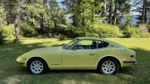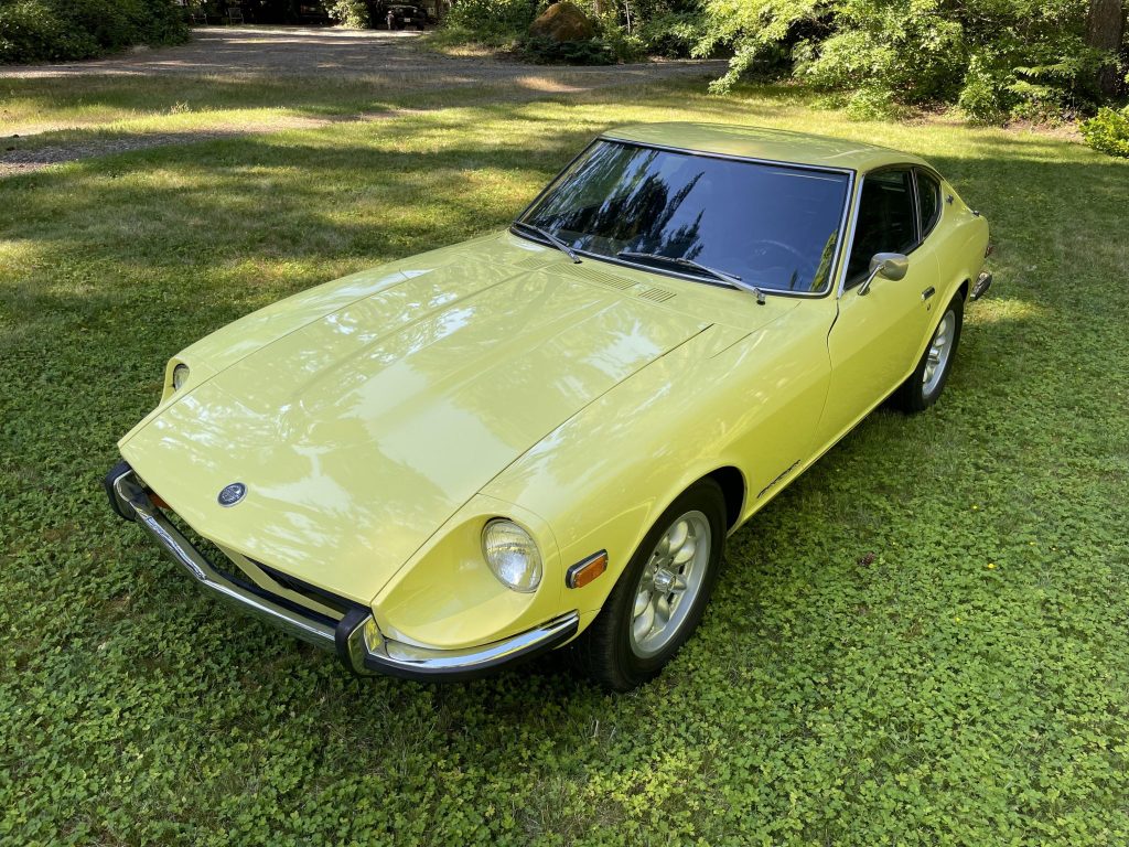 This 1971 Datsun 240Z is finished in Sunflower Yellow over black vinyl and is powered by a 2.4-liter L24 inline-six paired with a four-speed manual transmission. Equipment includes an aluminum radiator, dual SU carburetors, Tokico springs, 15″ Minilite wheels, and a Kenwood CD stereo. The car was first sold in Washington, and it was acquired by the seller from its reported third owner in February 2020.