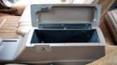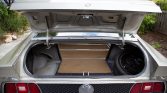 The interior features high-back bucket front seats and fold-down Sport Deck rear seats upholstered in Medium Ginger knitted vinyl. Woodgrain trim aLents the center stack and door panels and amenities include a full-length center console, lap belts for all oLupants, power steering, and an Alpine stereo linked with JBL speakers. The stereo is non-operational, and the seller notes discoloration on the center console lid, the center mirror housing cracked, and states that the headliner has become unattached around the rear window.