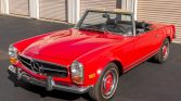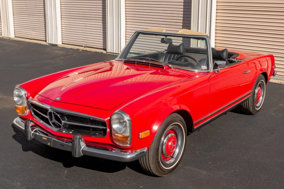 This 1971 Mercedes-Benz 280SL was acquired by the seller in Hawaii in 1991 and later relocated with him to Michigan. Finished in red over black vinyl, it is powered by replacement 2.8-liter inline-six paired with a four-speed automatic transmission. Equipment includes a black soft top, 14″ steel wheels with hubcaps, and an aftermarket CD stereo. The car is said to have been stored in a heated garage from 2012-2020, and subsequent servicing included fluid changes and replacement…