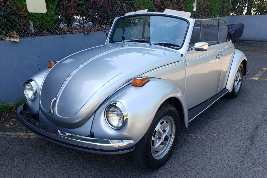 This 1971 Volkswagen Super Beetle convertible was acquired by the seller in 1987 and is powered by a modified 2,110cc flat-four paired with a four-speed manual transmission. The car is finished in silver over black upholstery, and features include a black convertible top, MacPherson-strut front suspension, chrome bumpers, side running boards, 15″ Lemmerz wheels, and vinyl bucket seats.