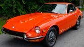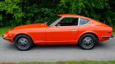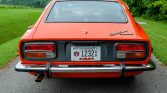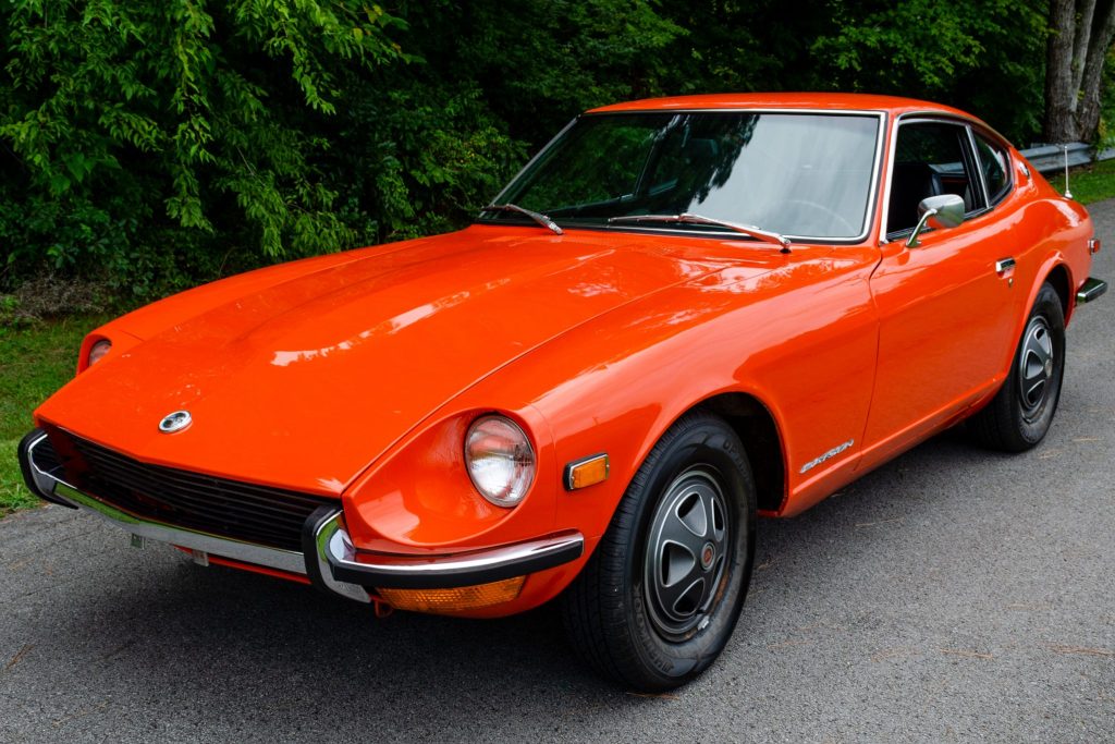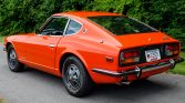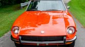 This 1972 Datsun 240Z is powered by a 2.4L inline-six paired with a four-speed manual transmission, and it is finished in orange over black vinyl upholstery. The car reportedly underwent a cosmetic refurbishment in 2000 and was purchased by the seller in July 2020. Equipment includes 14″ wheels with Z-logo hubcaps, power-assisted front disc brakes, dual SU carburetors, an aftermarket aluminum radiator, and European-style turn signals.