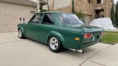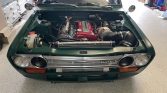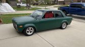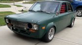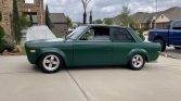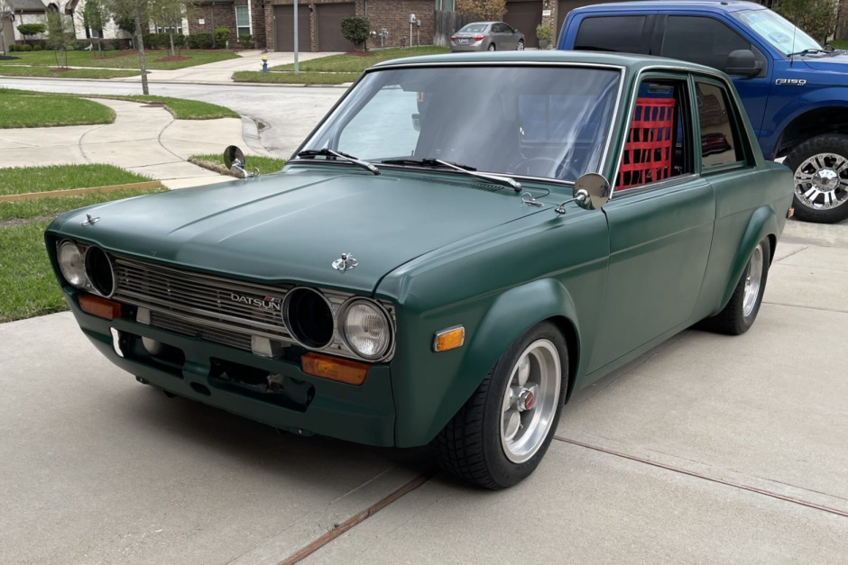 This 1972 Datsun 510 two-door sedan was acquired by the seller in 2006 and has been modified with fiberglass BRE-style bodywork, a six-point roll cage, and an SR20DET inline-four fitted with a T70 turbocharger, a GReddy intercooler, CP Racing pistons, and an AEM engine computer. The car is finished in matte green over black leather seats sourced from a C4 Corvette, and additional equipment includes a five-speed manual transmission with a short shifter, a 4.11:1 rear end with welded spider gears, 13″ Libre wheels, and KYB gas shocks. The front disc brakes were recently overhauled and the rear wheel cylinders, spark plugs, battery, and fuel filter were replaced. This 510 is not currently legal for street usage and is offered with records from the modifications and a clean Texas title in the seller’s name.