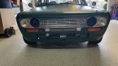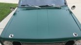 The exterior has been repainted Rock Moss Flat Green and fitted with a BRE-style fiberglass hood, trunk, front valance, and fender flares. The bumpers have been removed, the side moldings and door handles have been deleted, and door poppers with keyless entry have been added. Additional equipment includes hood pins, aftermarket window tint, and chrome side mirrors mounted on the front fenders.