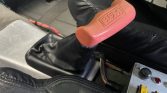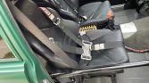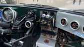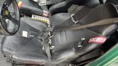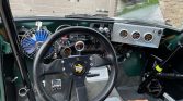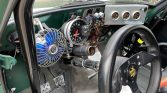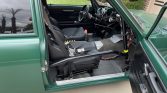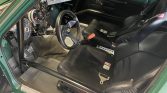 The black leather front seats were sourced from a C4 Corvette and are fitted with RJS racing harnesses. The dashboard, rear seats, and cargo area trim have been removed, while a six-point roll cage has been added, along with a driver’s window net, a B&M shift knob, a fan, a full-length rear view mirror, and a fire extinguisher. The battery has been relocated to the trunk and a cut-off switch installed.