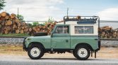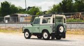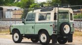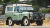 This 1972 Land Rover 88 has been refinished in Pastel Green and Limestone over gray cloth and is powered by a 2.25-liter gasoline inline-four paired with a four-speed manual transmission and a dual-range transfer case. Additional equipment includes a removable hardtop with safari windows, a roof rack, auxiliary lighting, Defender front seats, a front bumper with an integrated brush guard, a fire extinguisher, and a front winch.
