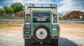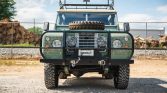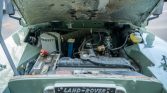 The all-aluminum body was refinished in Pastel Green under prior ownership and features a removable Limestone hardtop with safari windows. Additional exterior details include a roof rack with auxiliary lighting and a rear ladder, a front bumper with an integrated brush guard and Hella Rallye 1000 lights, wire covers on the headlights and tail lights, Land Rover-branded mud flaps, and rock sliders with an integrated step. The PTO-driven front winch is currently disengaged and the seller notes it has not been tested.