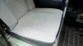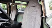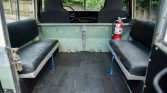 The interior features Defender front seats upholstered in gray patterned cloth joined by two inward-facing bench seats in the cargo area that are upholstered in black vinyl. Interior features include sliding side widows, tire-link floor mats, and a fire extinguisher. Cracks are visible along the black dashboard and the right rear bench seat is torn along the seat bottom.