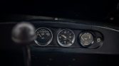 A three-spoke steering wheel fronts Jaeger instrumentation that consists of a 95-mph speedometer and a combination gauge for water temperature and fuel level. Additional gauges for oil pressure and voltage along with an analog clock are located on the lower dash. The five-digit odometer shows 35k miles.