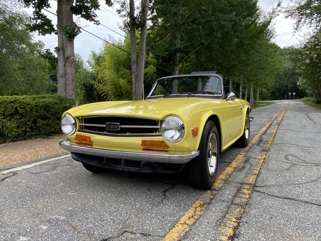 This 1972 Triumph TR6 was acquired by the seller in 1982 and received a cosmetic refurbishment in 2008, including a repaint, interior refreshment, and a replacement soft top. The car is finished in yellow over black vinyl, and power comes from a 2.5-liter inline-six paired with a four-speed manual transmission with overdrive. Equipment includes a black soft top, a bullet-style side mirror, and a cassette stereo.