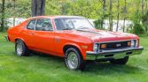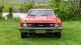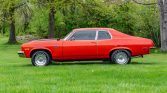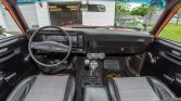 This 1973 Chevrolet Nova is powered by a 383ci stroker V8 paired with a Tremec five-speed manual transmission and is finished in orange over a black and gray interior. Equipment includes polished 15″ wheels, chrome bumpers, Nova SS decals, hood pins, manual windows, auxiliary gauges, and an aftermarket Eclipse stereo mounted in the dash.