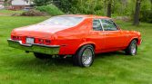 The car is finished in orange and features a raised hood with black aLents. Additional equipment includes a chrome driver-side mirror and bumpers, hood pins, tinted window glass, and Nova SS decals.