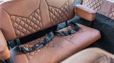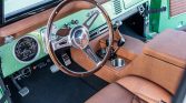 The replacement front bucket seats and middle-row bench are upholstered in saddle leather with diamond-stiched inserted, and color-matching material extends to the custom-fabricated center console, door panels, and upper dash pad. Appointments include a Lokar shifter, Vintage Air climate control, a family-style six-point roll cage, a Kenwood head unit, and a custom audio system. Twin rear-facing seats are mounted to the inside of the tailgate.