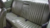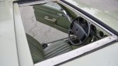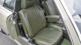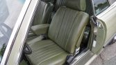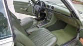 The cabin features Pine Green leather seats along with a matching dashboard, door panels, carpets, and floor mats. Equipment includes air conditioning, power windows, central locking, a lockable glovebox, and a Becker Grand Prix AM/FM radio. Refurbishment work in 2015 included new seat padding, repairing the audio system, and re-dying the center console. There is a stain on the passenger-side floor mat.