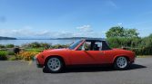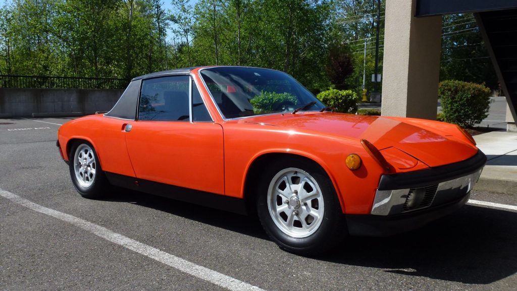 This 1973 Porsche 914 is finished in red over black and its replacement 2.0-liter flat-four is paired with a five-speed manual transaxle. Features include Fuchs-style wheels, disc brakes, a removable roof panel, replacement speakers, and an aftermarket stereo.