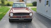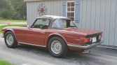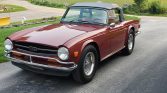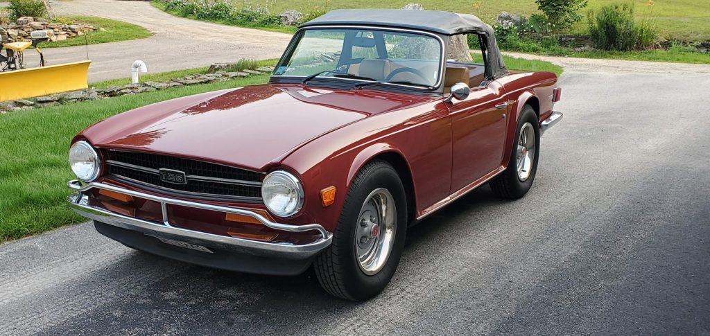 This 1973 Triumph TR6 is finished in red over a tan interior and is powered by a 2.5-liter inline-six paired with a four-speed manual transmission. Equipment includes a black convertible top with a zip-down rear window, a full-cockpit tonneau cover, and a front grille guard. The car was acquired by the seller in 2011, and a subsequent refurbishment at the seller’s shop was completed in 2015. In addition to a repaint, the seller states that the brakes and suspension were overhauled and that the fuel tank, sender, and lines were replaced. The engine and transmission were reportedly rebuilt with modifications said to include an electric fuel pump, a lightened flywheel, and an aftermarket camshaft.
