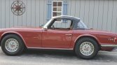 The car was repainted in its original Carmine Red (82) during current ownership. Exterior features include a black vinyl convertible top, a matte black front air dam, a chrome left side mirror, and TR6 graphics on the rear fenders.
